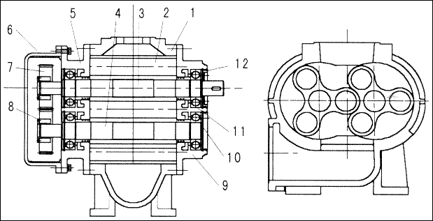 ④拆羅茨風機前軸承蓋螺母,取下軸承壓蓋,拆軸承調節(jié)螺栓,取下調節(jié)片,用螺栓頂出軸承座和軸承,然后卸出軸承和挖出骨架封圈。